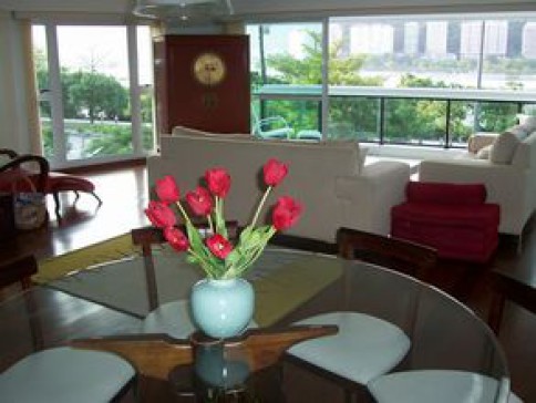 The apartment has wooden floors throughout, with 4 bedrooms -each has ensuite bathroom- and a further bedroom in the service area. A well-equipped kitchen-diner and very large living/dining room. The living room has floor to ceiling windows on 2 sides, giving the room a warm and inviting feel, while also offering fantastic views across the lake set in front and of Rio’s famous Christ statue. Air-conditioning throughout, extensive balcony areas, communal swimming pool, secure garage parking and 24 hour on-site concierge/security.