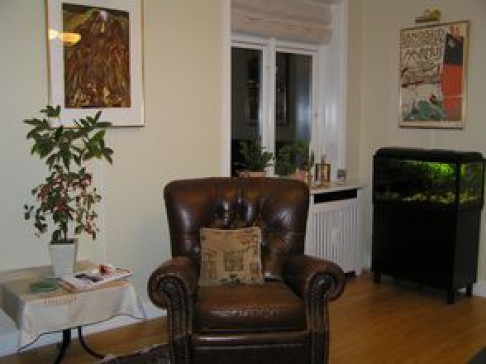 Our home overlooks playing fields and there's also an olympic-size public pool just across the street. The apartment (built in the 30es) was redecorated just two years ago. It contains hall, office, living room, dining room, kitchen, bathroom, extra toilet, master bedroom + two additional rooms (1 with double bed). Washing machine is available in the the basement.