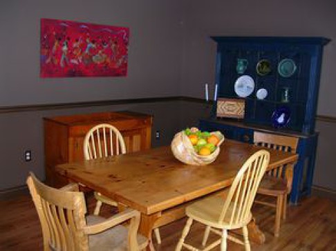 The house is fourteen years old with a large front porch and a back deck which overlooks a wooded area. There is an outdoor children’s climber. We have a guest bedroom with a king-size bed and ensuite bathroom with Jacuzzi tub. The upstairs has room for another six people. There is a double futon in the playroom. We have a 14 foot aluminum boat which can be used for fishing or touring the lakes. We have a canoe and full outfit of camping equipment, also available for use. There are lovely bike trails and we have 2 mountain bikes. In the winter we have skiis and snowshoes to use. Our house is set up for kids. We have exchanged before and enjoyed the experience very much.