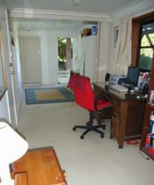 2-level house, with 2 bedrooms upstairs, bathroom, study, sunroom, verandas front and back, a downstairs living area with shower & toilet. Open plan kitchen, dining and lounge. Large sloping lawns (mower arranged), abundant birdlife, nocturnal possums.