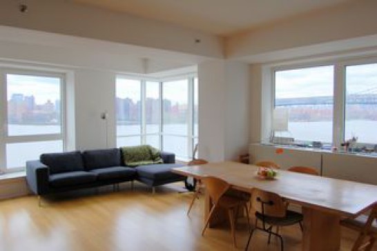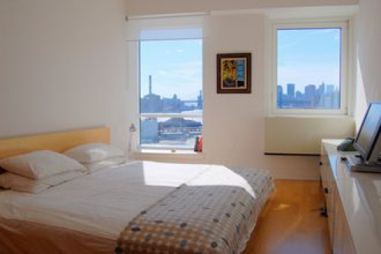 Spacious, new and sunny 8th floor apartment on the East River in Williamsburg, Brooklyn. 1450 square feet (135 square meters). Incredible views of Manhattan skyline from wrap-around windows in every room. 3 bedrooms, 2 bathrooms, big living room area with grand piano. All new AC, washer/dryer, broadband, flat screen, etc. Building amenities include use of gym, 24 hour doormen, outdoor river promenade and 24 hour garage. Car could also be included - Toyota Prius hybrid.