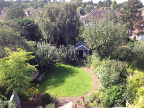 Secluded back garden with sunny aspect, play house and climbing frame. Patio area with BBQ and table tennis.