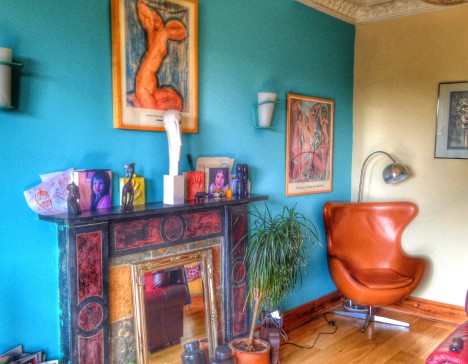 We live in a duplex apartment in a traditional Edinburgh tenement in Leith, close to the city centre. Our home has wonderful views to the south of Edinburgh. On the top floor there is a double bedroom, 2 single rooms (both with slide out extra beds) and bathroom. The lower floor has 2 living rooms (one with double sofa bed), office and well equipped kitchen/dining room and second bathroom.