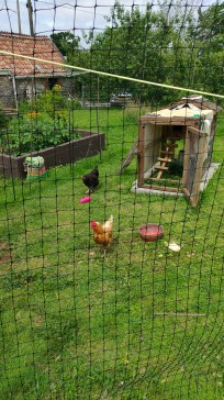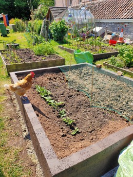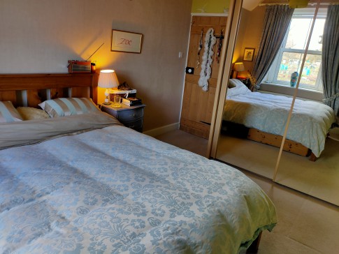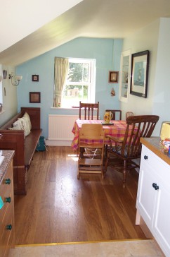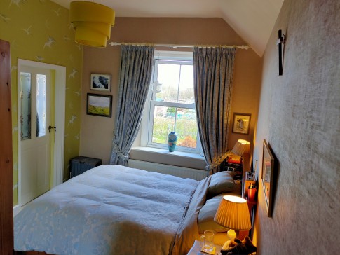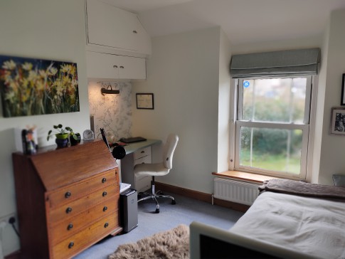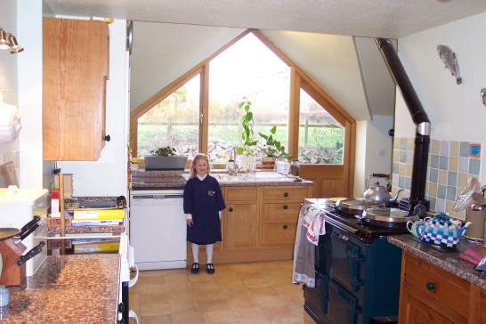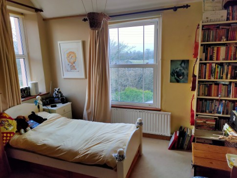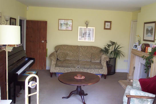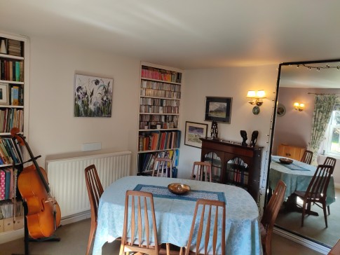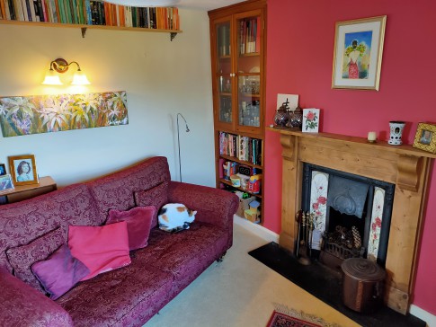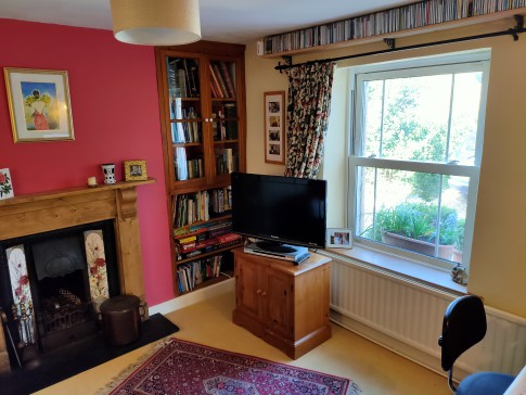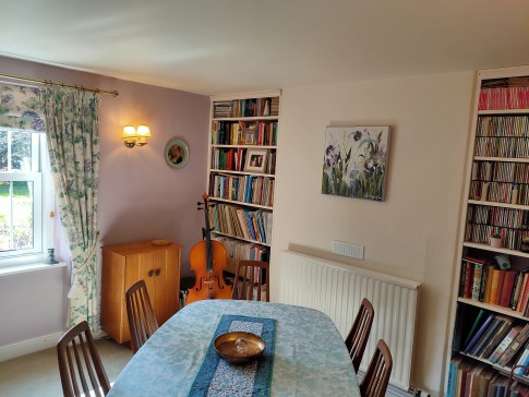Our house is a large cottage in a quarter acre garden on the edge of the village: fields on three sides and views across to the hills from the breakfast room.