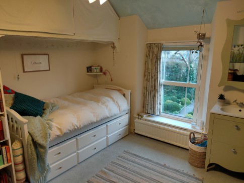 Four bedrooms: I double (with en-suite); one single with single slatted pullout chair/bed; one with single plus 4` sofa bed (slatted Dunlopillo): one with single bed and single slide-out bed underneath; 3 reception rooms (one with piano). Dining room seats 10. Large kitchen/breakfast room (also seats 10) with large window onto allotments and hills, dishwasher, washing machine (no drier), Aga plus electric cooker for when it`s too warm to have the Aga on. Lots of books and toys, cot available. Large garden with swing seat, and treehouse. 10` unheated freestanding pool in the summer. Patio with furniture.