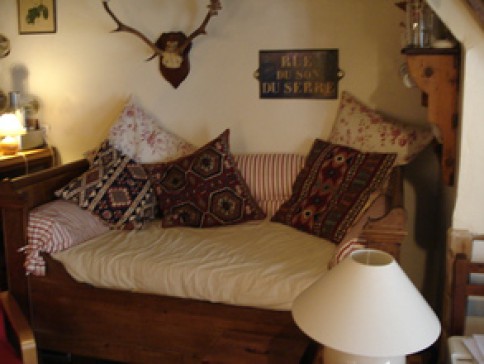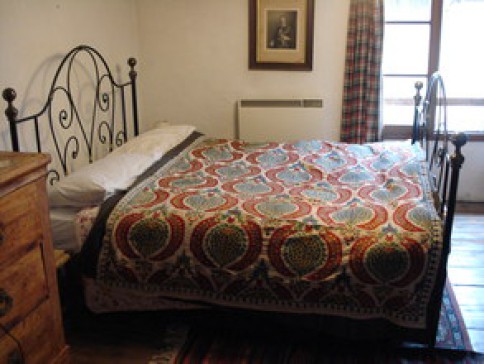 The house has three large bedrooms; two of which have en suite shower rooms, the other has an adjoining bathroom. The ground floor has an open plan kitchen & sitting room, complete with a traditional sleigh bed! The house is full of rustic charm, with lots of larch beams & parquet floors covered with kelims.