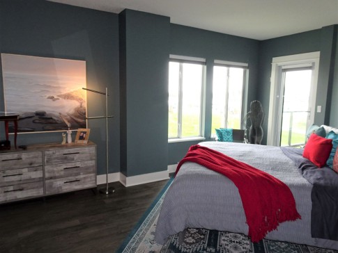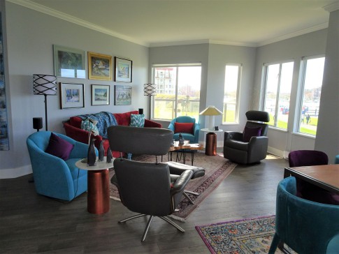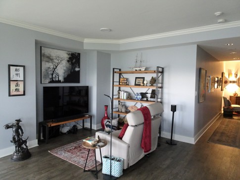 The 140 m2 or 1500 ft2 condo has a large open living dining TV great room with excellent views, an efficient kitchen with an eat-at island, a large master bedroom with king (actually 2 XL twin adjustable beds,) walk in closet and luxury walk-in shower ensuite, second bedroom/study furnished with a comfortable sofa bed, a second bathroom with tub and shower, a separate laundry, and two small decks.  Situated on the main floor of an eight-story building, the unit is actually a full story or more above the ground, facing on to a park at the edge of the water.