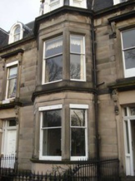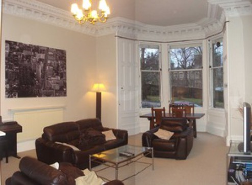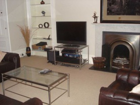 One bedroom flat in an 1860 Victorian townhouse with a view over one of Edinburgh's best historic buildings. 10 minutes walk to the centre of town and 5 minutes walk from airport bus. Quiet up-market area. 13 foot ceilings (except passageway and bathroom). Large drawingroom to the front with fireplace and original period cornicing. Bedroom faces the rear and has a kingsize bed (very quiet room). Good size modern kitchen. Use of computer with broadband internet. Cable TV.