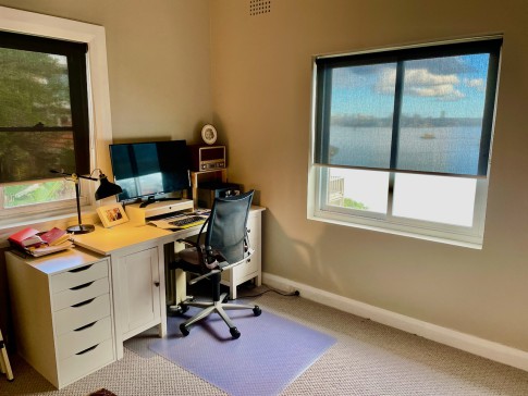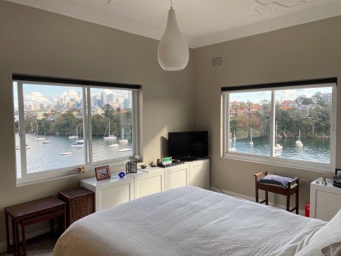 This is a small (85sq m) apartment located on the top floor of a waterfront 1920s Federation apartment block. It is an ideal place for a couple, although you do need to be fit as there is no lift. Classic high ceilings and windows on three sides make this a private, yet open and light filled place to live with a stunning view of Sydney Harbour. As you would expect the kitchen and bathroom have been brought up to 21st Century standards and the rest of the unit is comfortably furnished. The second bedroom is used as a study The unit is not suitable for children because the older style of windows make it too dangerous for little ones.
