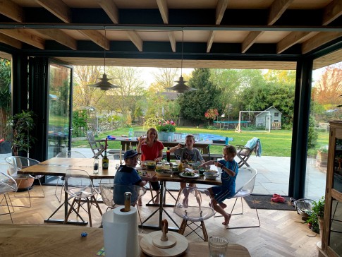 We have recently extended our kitchen to a modern and large open plan living space with bi-folding doors opening out onto a patio and the garden. The kitchen is an ideal space for entertaining or relaxing and where we spend most of our time. Close to the kitchen we have a cosy snug with TV and log burner. We also have a playroom/music room (with piano and drums) full of toys and games and a traditional lounge/sitting room with log burner for cosy evenings by the fire. Upstairs we have 5 large bedrooms and two bathrooms.