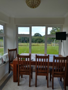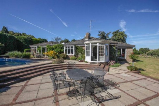 A large bungalow with 4 acres of pasture with two tame pet sheep, a stream and 2 ponds on the edge of Hertford Heath village, with views over open countryside. We are an outdoorsy setting with covered swimming pool, barbecue and large outdoor courtyard dining setting, trampoline and play equipment and toys (we have a boy aged 11 and girl aged 7). Plenty of room indoors with 4 bedrooms, 2 living rooms, a conservatory/kids play room and 2 dining areas.