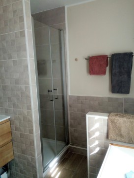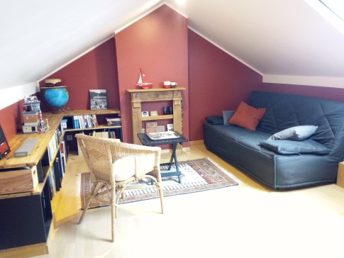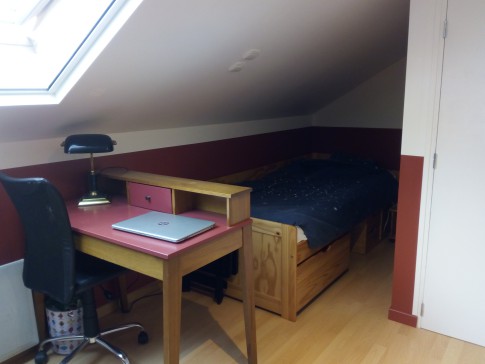 Living room and kitchen open on the garden (and WC at that floor). At the first floor, bathroom with a shower (no tub), 2 bedrooms + an office and at the second floor, a large bedroom under the roof.