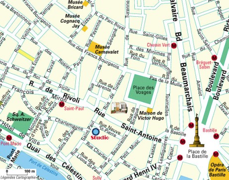 32 rue St. Paul is located in the heart of le Marais (the 4th arrondissement), what many consider the most beautiful and historic neighborhood in Paris. Most of the buildings in the Marais date from the 17th and 18th centuries, and the narrow streets, beautiful squares, and stunning architecture provide for hours of delightful rambling and exploration. We have three metros close by: St. Paul, Pont Marie and Bastille. The studio is within easy walking distance of the Place de Vosges, the Bastille, the river Seine, Ile St.-Louis, Notre Dame, the new Paris Opera House (at Bastille), theaters, cinema, open markets and shopping of every sort (be sure to pop into the charming Village St. Paul, right across the street, with its many antique shops and cobble-stoned courtyards). You ''''''ll find a multitude of museums in the immediate vicinity: cf. especially the world-renowned Picasso Museum, the Musée Cognacq-Jay, where you not only get wonderful artworks but an 18th-century mansion, the Maison Internationale de la photographie, the Musée Victor Hugo at the Place de Vosges, the Musée Carnavalet, the latter two of which now have the added bonus of being free! Just across rue St. Antoine, the Hotel de Sully nearly always has first-rate exhibits ''''''definitely worth checking out. The Pompidou Center is also within walking distance, with its excellent Museum of Modern Art, its many permanent and special exhibits, and fabulous views.