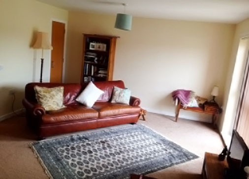 Large bright sitting room with dining area, patio door & two windows on ground floor front elevation looking towards Arthur's Seat.
