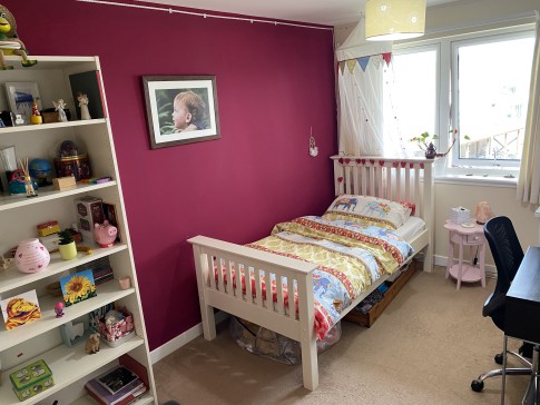 Large kid's bedroom with very comfortable bed and fitted wardrobes.