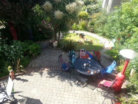 Two big tables, lots of chairs, barbecue, 2 adult size bike, two kids bike + scooter & skateboards