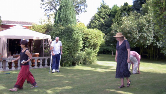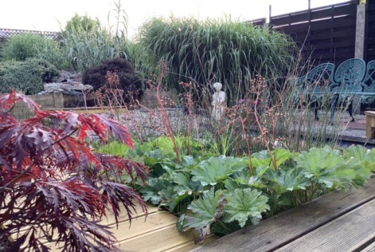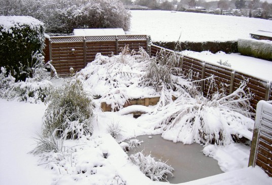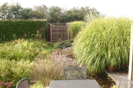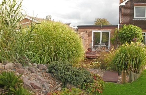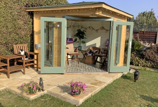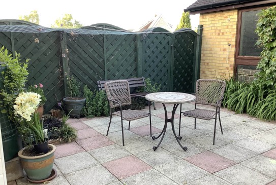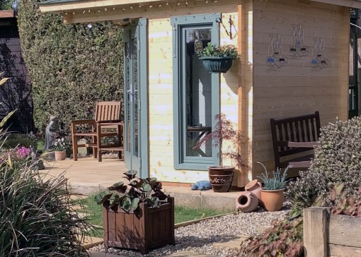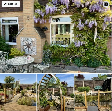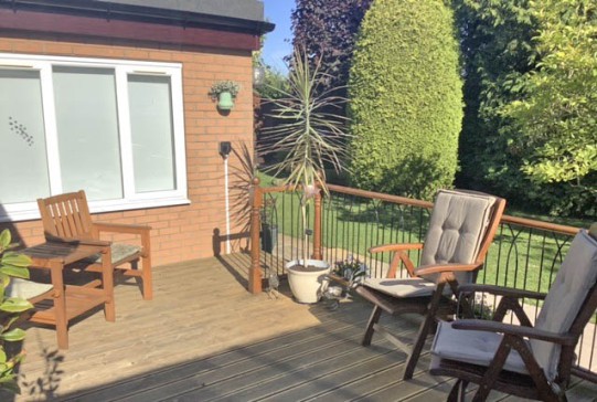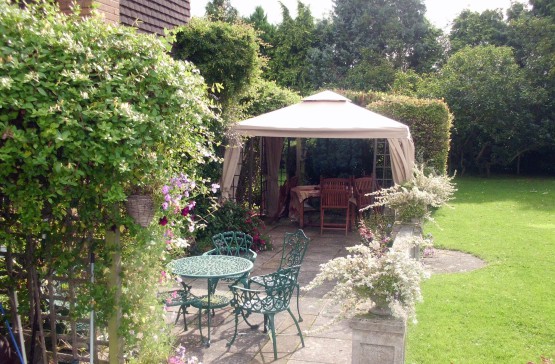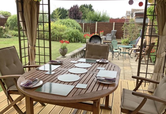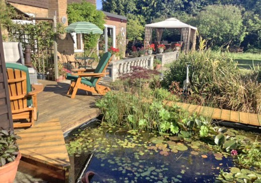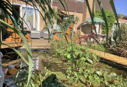 Outside we have a very private enclosed garden with a kitchen patio, a terrace (sliding door from dining room) and a deck overlooking the pond (sliding door from study). We have two further decked areas and a summer house to catch the morning sun.