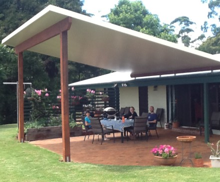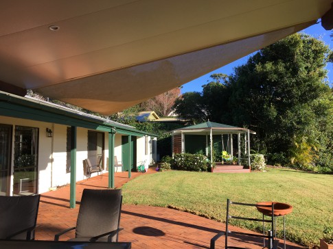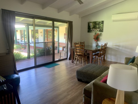 A private 75 meter driveway past trees and gardens brings you to our home which is a comfortable modern design with large open lounge dining kitchen area looking out onto covered patio with views forever over rain forest and hills. Bedrooms run off this area including a seperate family room surrounded by verandas on all sides.