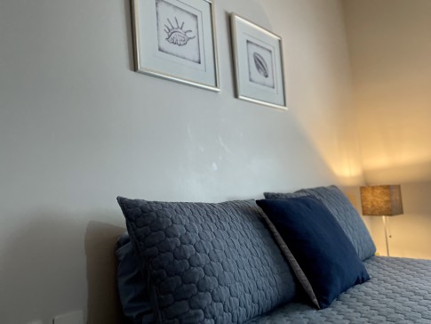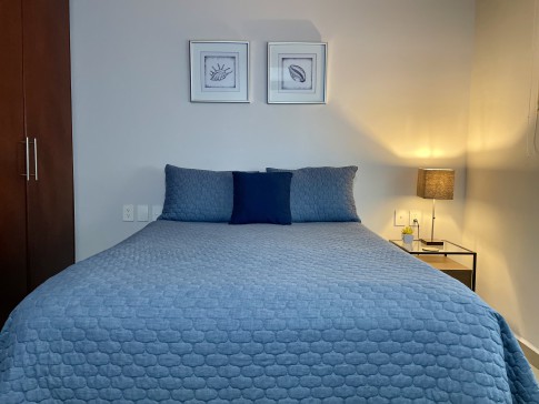 The kitchen if fully equipped. All rooms have air conditioning units, and both bedrooms are equipped with closets. There is no pool.