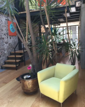 An ultra-modern gourmet kitchen, two storey open-concept living room with gas fireplace, showpiece staircase and soaring glass walls, give this loft a sense of space and elegance. A beautiful yucca tree serves as a divider between living room and dining/kitchen area with a retractable glass ceiling that allows the tree to thrive.