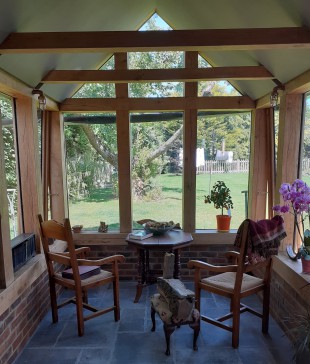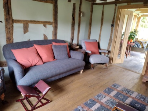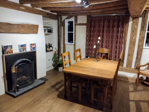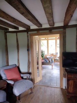 The other half of the house has our renovated sitting room - lots of beams and interesting fireplace, that opens out to a light and airy garden room overlooking the work-in-progress back garden. This has a greenhouse and some veg beds and a chicken area with two chickens - Mavis and Rita - who we would ask you to feed in exchange for fresh eggs. The garden is secure, with ample room for dogs and children to play in. The front garden is now a real cottage garden, with hundreds of plants and lots of colour.
