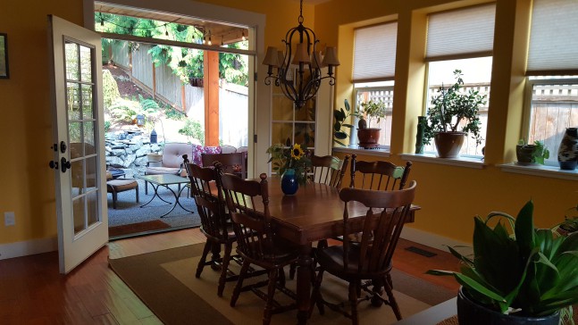 Our home is 2500 square feet and has 2 very spacious bedrooms with a king bed in the master bedroom, a bunk with a single and double bed in the other room, and the option to sleep 2-4 more people on inflatable or foam beds. We have 2 1/2 baths, an office, a large living and dining room, an eat-in kitchen with a bar area, a fully equipped spacious kitchen, and a den/media room. We have made many adjustments to make our home and yard eco-friendly and low-toxic for clean and healthy living for both us and the planet.