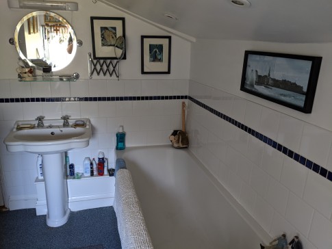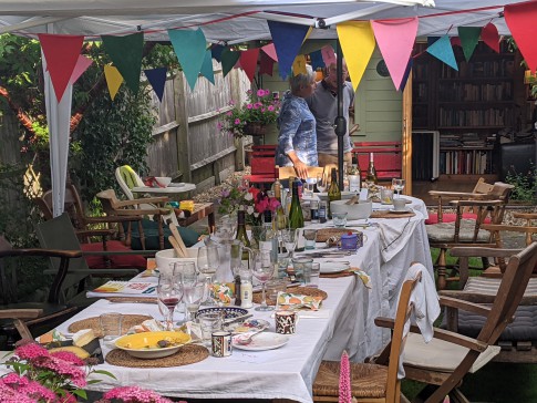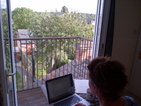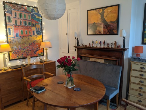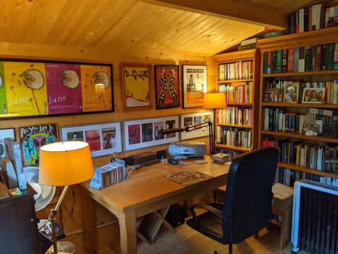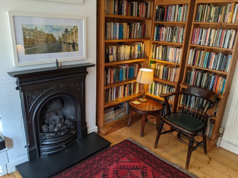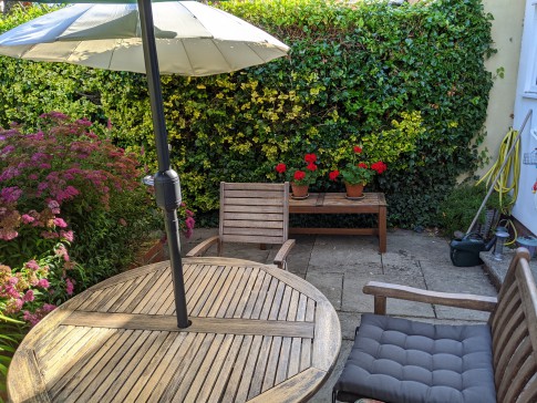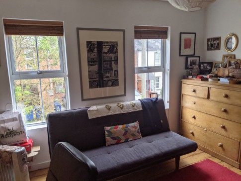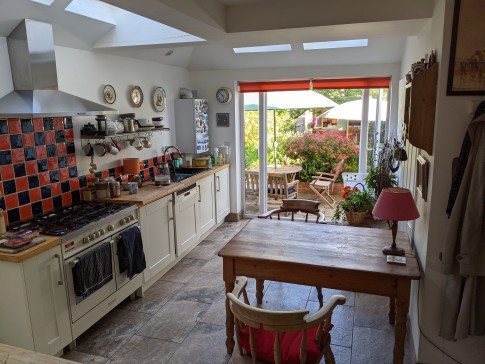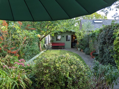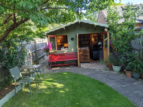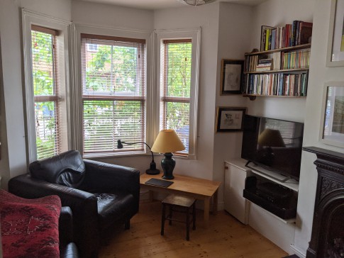 Our house is a 3-bed end of terrace Victorian house with a patio and lawned back garden. It has a large and very light kitchen dining room with double doors that open wide onto the garden. At the end of the garden is a large book-lined studio office with double doors that also open onto the garden. The front room is a small library with a large TV (Sky). There is a toilet on every floor and three double bedrooms. The top master bedroom is ensuite with a bathroom and a balcony overlooking a wide panorama of allotments and parks.