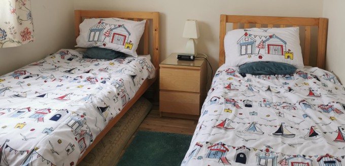 One bedroom has a double bed while the other has two single beds.