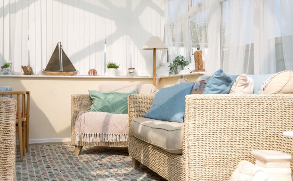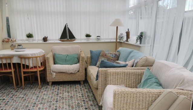 The conservatory leads off the sitting room and is a lovely bright room to relax in. A two seater sofa and two armchairs are there with a dining table and four chairs.