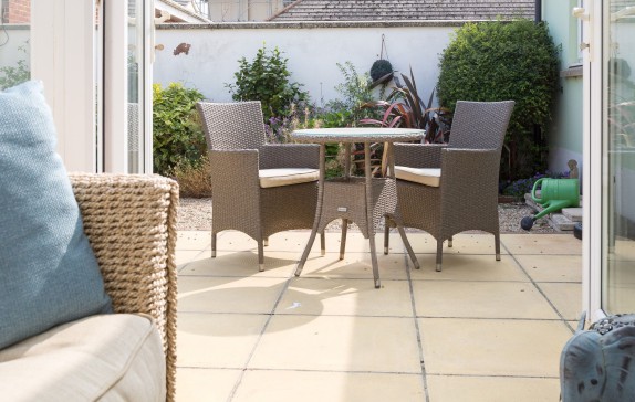 There is a courtyard garden with a table, chairs and parasol.
