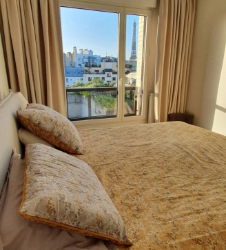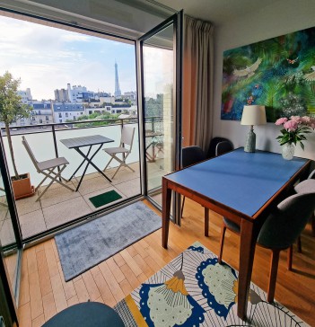Our flat has the breath-taking view of the Eiffel Tower, from every room (even the kitchen) and from the south facing terrace. It is on the top floor of a renovated 19th century former convent, away from traffic noise, despite being in central Paris. There is a king size bed, a modern well-appointed kitchen and large bathroom. The 2nd room can be used as a study/office. Stylish, uncluttered and comfortable, with plenty of space for a couple.
