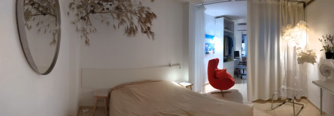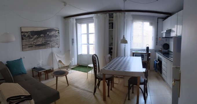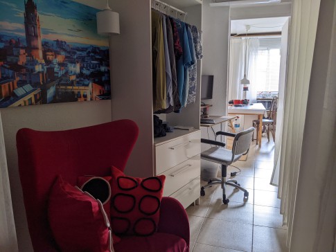 (The detailed layout: From the entrance hallway, you enter a space with a door to the bathroom, and a door to a dressing room, which has plenty of storage (and a single bed in it), and is what is called in Spain an `interior` room. The third door leads straight to the double bedroom, and is also an interior room with windows to a light well. Passing through this space, there is a study /sitting area. A door leads to the light-filled kitchen / dining / living room, with a sunny outlook. This large room has a balcony onto the pedestrianised street below).