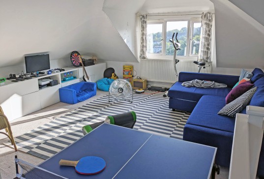 Three bedrooms (one superking, one double and one single), plus a loft/games room with a fold out sofa bed that can sleep two.
