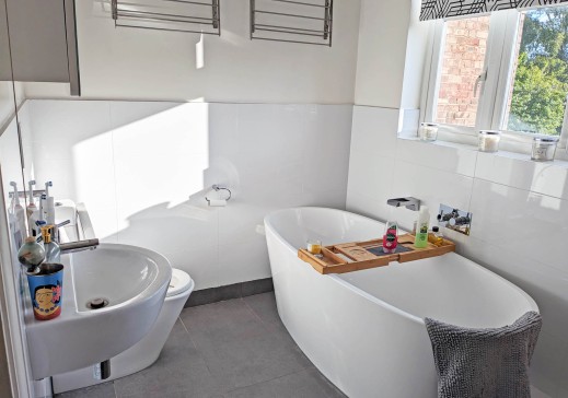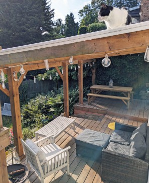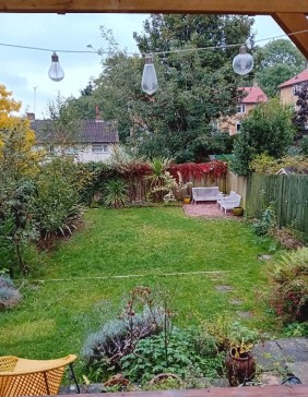Outside there is a pretty 60 foot garden with a lot of neighbouring trees that attract bird life. The garden has many plants and flowers, and a covered deck with comfy seating and a table for outside dining and relaxing, whatever the weather. There are also a few cosy nooks in the garden for reading and dining.