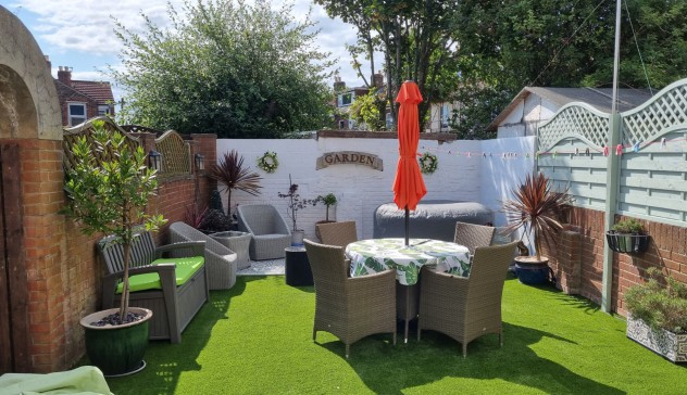 Garden room with French doors to small back garden with outdoor seating and dining.
