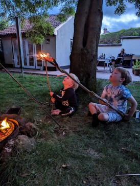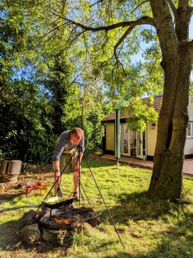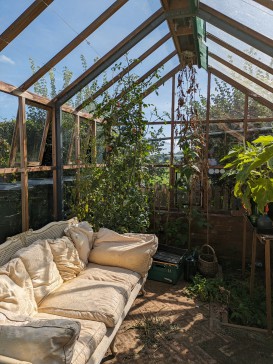 The south facing enclosed garden has a number of different areas with a patio, a pergola, a plant house with a sofa and plenty of lawn for lounging. There is a BBQ, pellet grill and campfire, so there are also plenty of options for cooking outside.