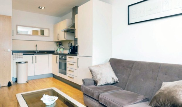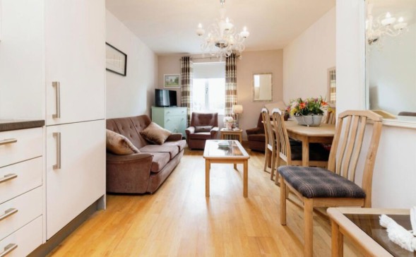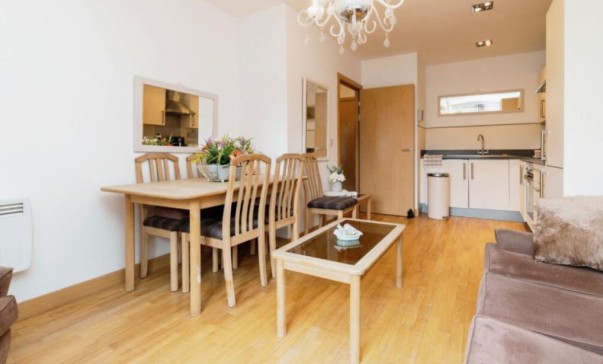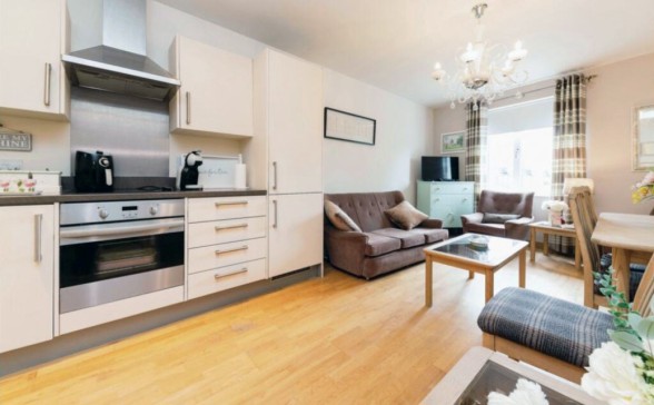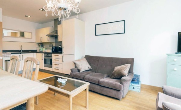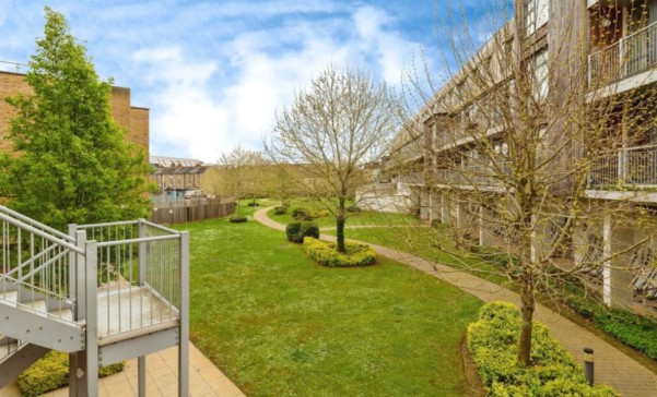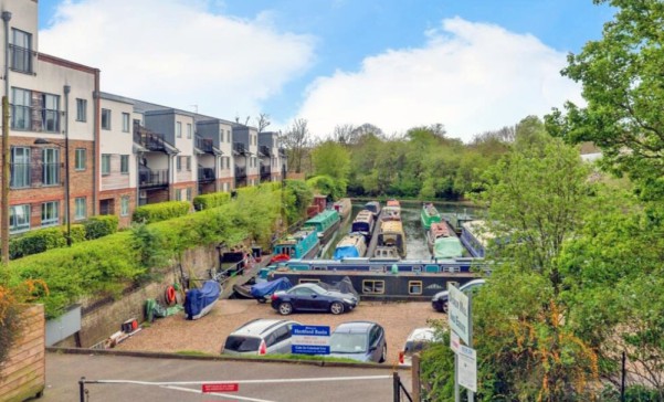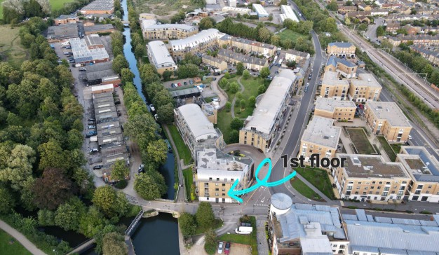 Lea Valley Marina views out of first floor one bedroom, one bathroom apartment with kitchen-diner-lounge area and lift to an underground car park space. Sunken communal gardens. Entryphone and secure indoor postboxes. Electric heating in all rooms. Up&Over windows. Cross-trainer bike.