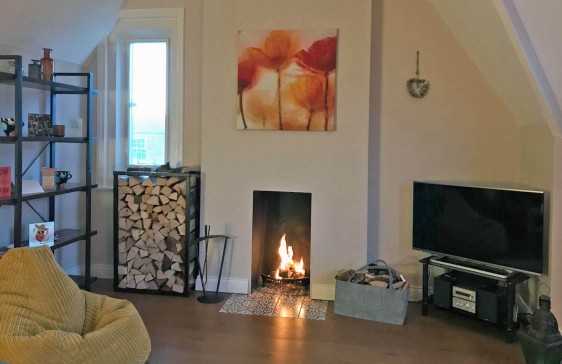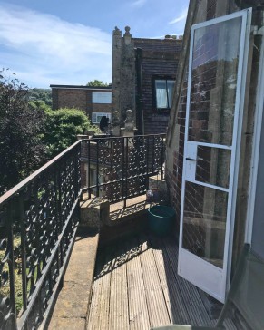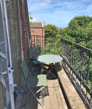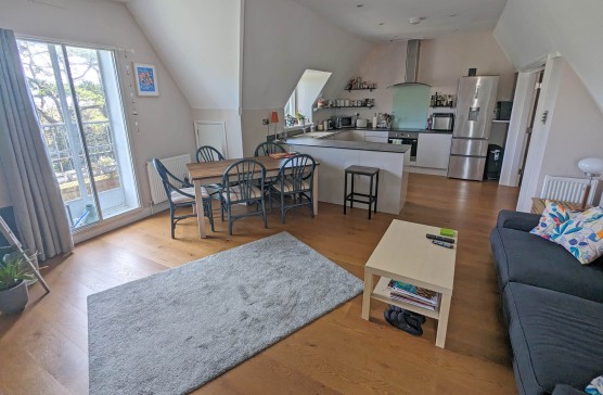 The clean and spacious second floor flat has two double rooms with king sized beds and a third room with a double sofa bed. A south facing balcony with sea views is located off of the open plan kitchen / diner / lounge which has a log fire.