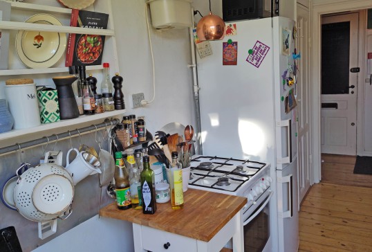 Kitchen with all necessities, 2 bedroom, one living room. A third room exists but will be closed with private belongings stacked away.