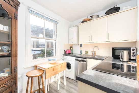 The flat is on the upper floors of a Victorian house in Springfield Road. The reception room has high ceilings and wide bay window which allows natural light to flood the space, and a period fireplace. The south-facing double bedroom overlooks the rear and benefits from high ceilings. Also on this floor is the fitted bathroom with window, and the second bedroom, which is more of a single study size to the front. At the rear of the apartment, the kitchen enjoys views over the viaduct, which is a structure of historical interest, forming a striking backdrop beyond the gardens.
