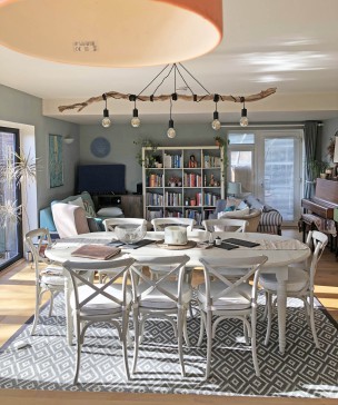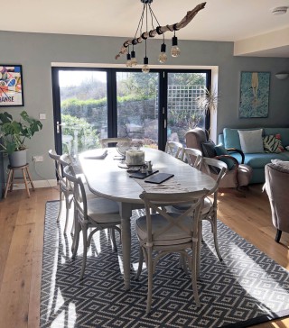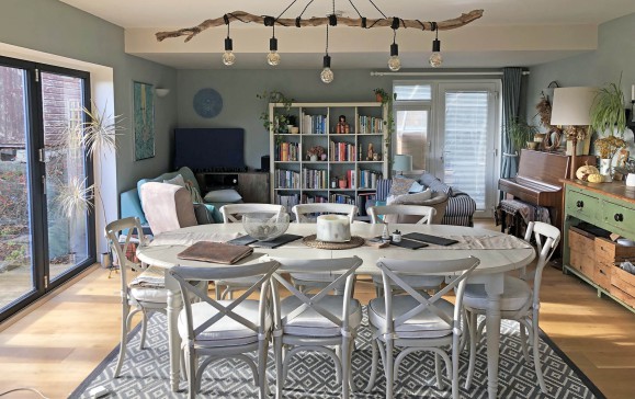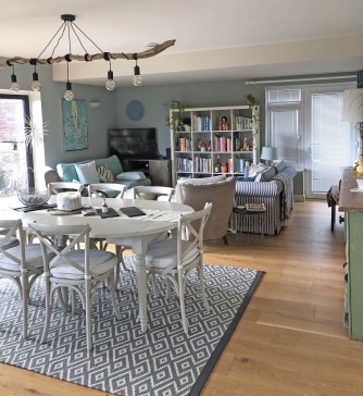 Just a five minute walk from Kingsbridge town centre (and a short hop and a skip to Salcombe), our home offers a wonderfully relaxed space to unwind… calming coastal hues, wood floors, cosy fabrics, modern art and vintage furniture-finds combine in our 50 square foot open-plan, living-dining room with bifold doors opening on to the garden with its 2 wildlife rich ponds just a step away.