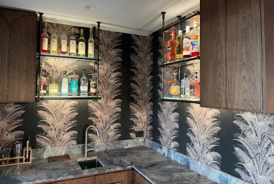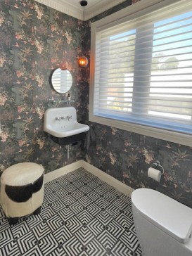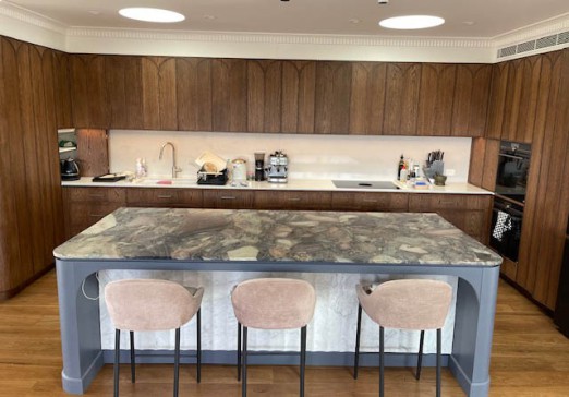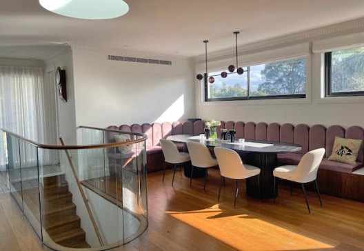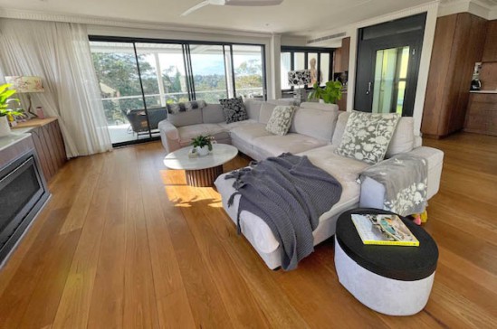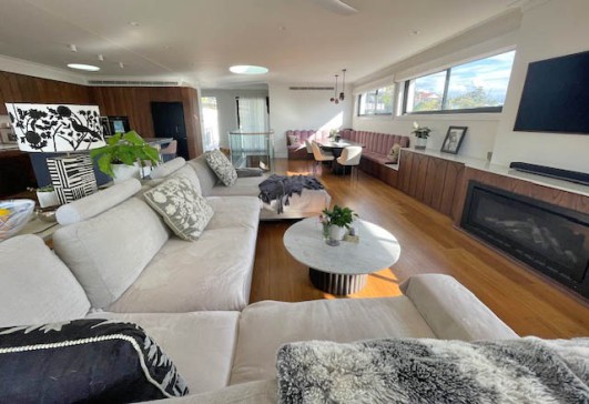The living area is open plan with a large, fully equipped kitchen with quartzite benchtop and custom cabinetry. The dining area is velvet art deco banquet style seating around a large table that seats up to 10 people. The large lounge is centred around the gas fireplace and the bar opens out to the large balcony which looks over the district and towards the Manly pines and the sea. A dining table for 6 and lounge area with opening roof are located on the balcony, as is a Weber gas bbq.