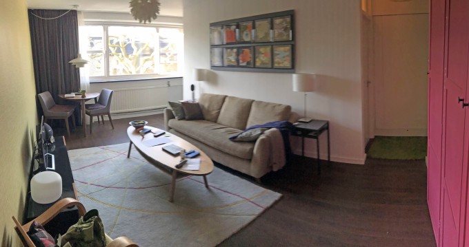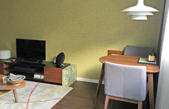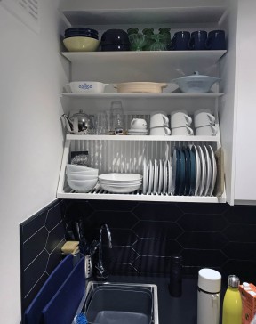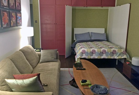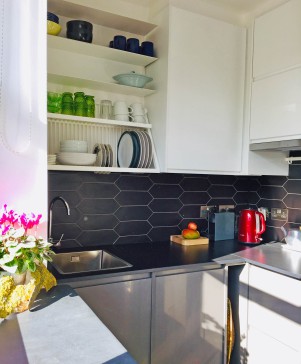 There is ample storage, a very comfortable sofa, dining space for two people and a compact kitchen, with dishwasher, fridge/freezer, Nespresso coffee machine, combination microwave oven and single induction hob.