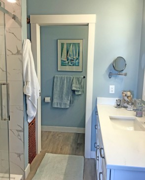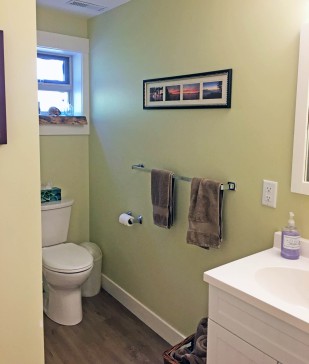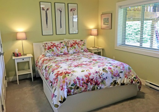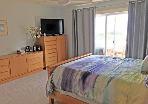 The master bedroom has a new king bed (coming November 2024) and sliding doors to the deck. The adjoining ensuite bath has a large shower with a bench and double shower heads and there is a separate toilet room. Heated floors will keep your toes warm if it's chilly outside.