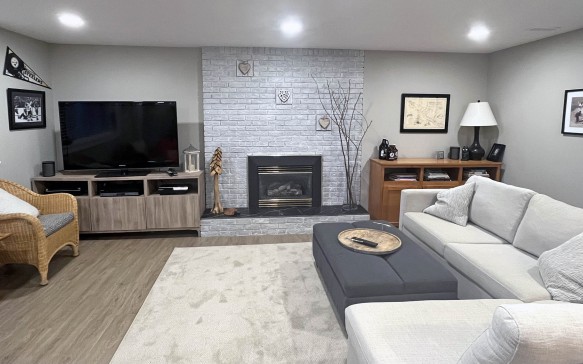 The downstairs bedroom has a queen bed, garden view and a bathroom down the hall with tub and shower. There is also a bunk room, and an additional living area with a gas fireplace and sliding doors for access to the back yard