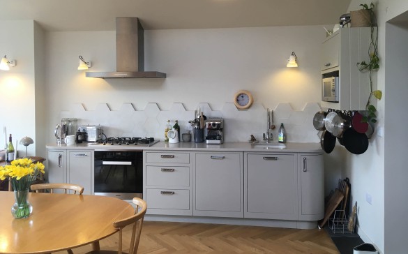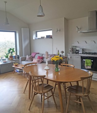 Downstairs is a large, light filled open plan kitchen-diner. At one end is a lounge area with a comfortable sofa and arm chairs to read a book, or gaze out of the large picture window with views across the rooftops to the distant fields and Radnorshire hills. Bi-fold doors open onto a patio area for outside eating and leading to steps down to a small enclosed terraced garden with a further lower patio and BBQ.