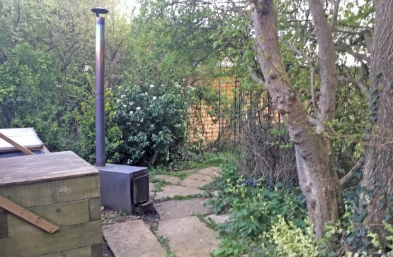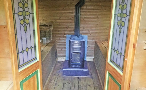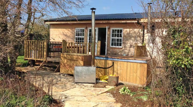On the decking there is a wood fired hot tub and a cross the garden surrounded by trees is a wood fired sauna.