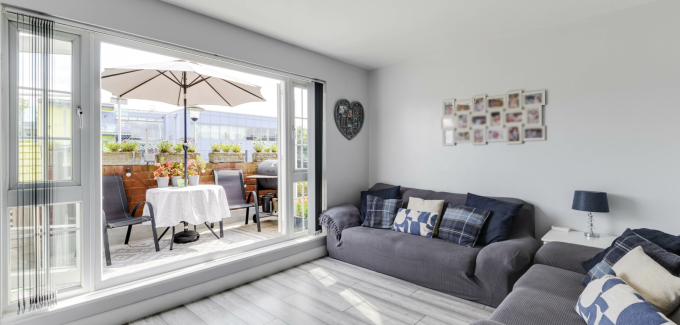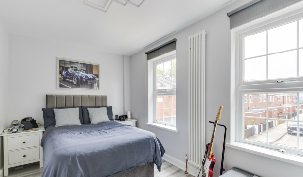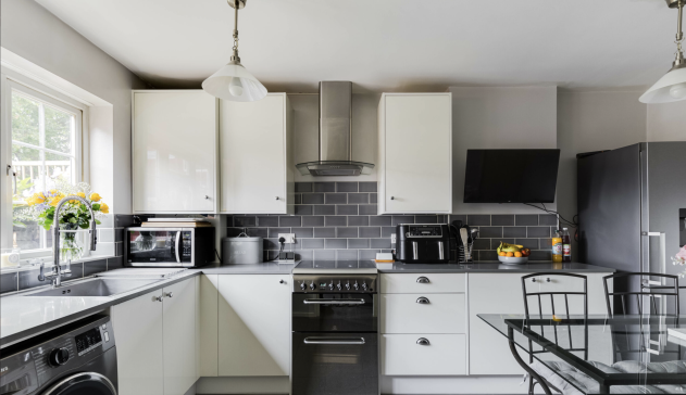 This 3-bedroom flat in central Hackney is comfortable and well-maintained. The apartment is clean, bright, and airy, with a balcony and a parasol for relaxation. A small front yard has colorful flowers. The spacious living room and kitchen, equipped with a dishwasher, are great for cooking and entertaining. The master bedroom has a super king bed, another has a king-size bed, and there’s a functional office space.