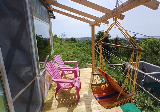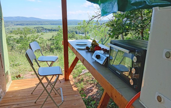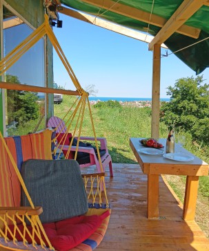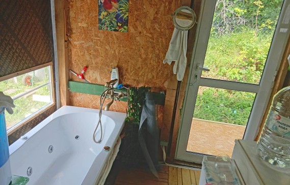 Its a cabin in a totally green setting. Only 10 mins walk town the hill to supermarkets and two gorgeous beaches of the Black Sea. Off grid with 10 big solar panels and Lithium battery`s. There`s four water tanks for rainwater. Hot water septic system and jacuzzi spa bath. Indoor and outdoor kitchens. Spacious. Great for one or two people. Own private fenced garden - 2000 sq meters. Panoramic sea and mountain views.