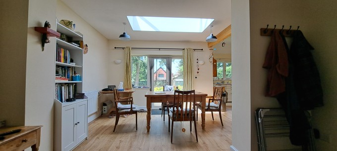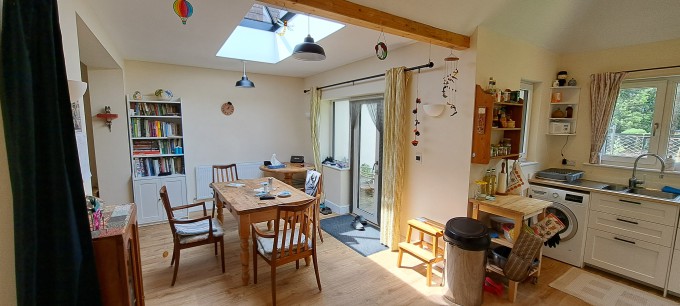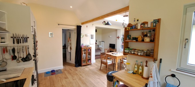 Open plan Kitchen, Dining area with overhead canopy & study. Induction hob, Oven, Microwave, Fridge/Freezer, Washing Machine, TV, 2 seat reclining Sofa, Freezer, Smart speaker, Digital radio.